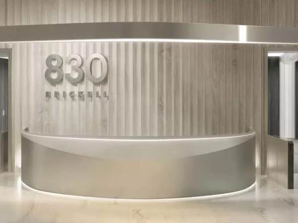 Taking full advantage of the location, 830 Brickell’s office spaces reside near Brickell Avenue in the financial district of downtown Miami. Adrian Smith + Gordon Gill Architecture, the acclaimed firm behind the Jeddah Tower and Burj Khalifa, the world’s tallest towers, intertwined 55 stories and 1,030,000 square feet of uninterrupted glass, illuminated day and night by the warm hues of Miami Beach Bay and nighttime lighting.