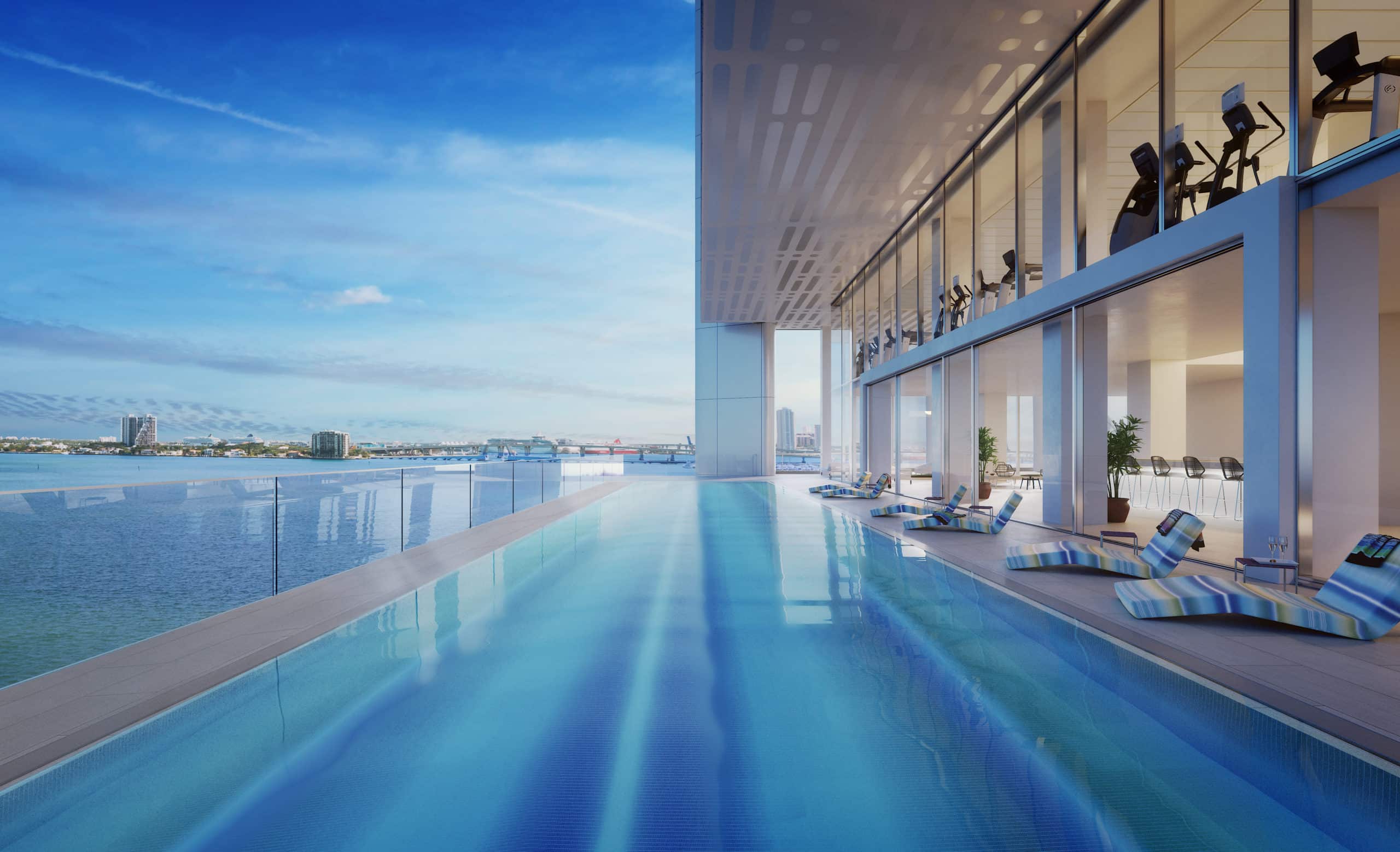 On the fifth and sixth floors of the tower, amenities include a bayfront lounge space with an ocean-view pool, an entertainment room, a beauty salon, a children’s playroom, a pet spa, an expansive fitness center overlooking the bay, and one of Miami’s largest spas. Exclusive for residents. An exterior bridge that connects the sixth-floor rooftop amenity with the pool’s sunroom, which includes cabanas, an Olympic-sized pool, lounge pool, water options for children, and a tennis court.